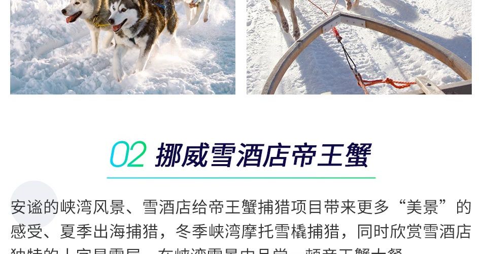 作为帝王蟹捕捞的开山者,希尔克内斯依靠帝王蟹捕捞活动,把整个城市变成旅游胜地;在安谧的峡湾风景、重视细节体验的雪酒店给帝王蟹捕捞项目带来了更多“美景”的感受、夏季出海捕捞,冬季摩托雪橇捕捞,同时欣赏雪酒店独特的峡湾景观、在峡湾雪景中品尝一顿帝王蟹大餐。