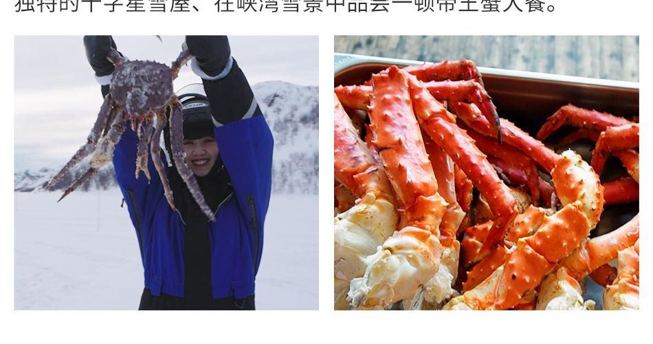 帝王蟹是世界上体积较大的蟹种,属冷水蟹,由于其特殊的生活习性决定了在巴伦支海地区的首府希尔克内斯一线的海域有数量庞大的帝王蟹聚集生活并大量繁殖。一早跟随探险专业人士捕捞帝王蟹。经过北挪威峡湾风景中短暂的旅程后,开始捕捞活动。随后返回营地烹饪帝王蟹,并享用美味的帝王蟹大餐。味道鲜美的帝王蟹肉加上面包和私家调味品,一只普通帝王蟹会有4-8公斤,但是挪威当地人只食用帝王蟹口感好的白色蟹腿肉,而蟹钳长度也能超过成人的胳膊,大的甚至可达到2米,肉更是汁多味美,堪称人间美味。蟹腿和蟹钳的肉质带有一种天然的甘甜与北冰洋海水的滋味,然后料理帝王蟹好的方式就是用海水煮后直接食用。