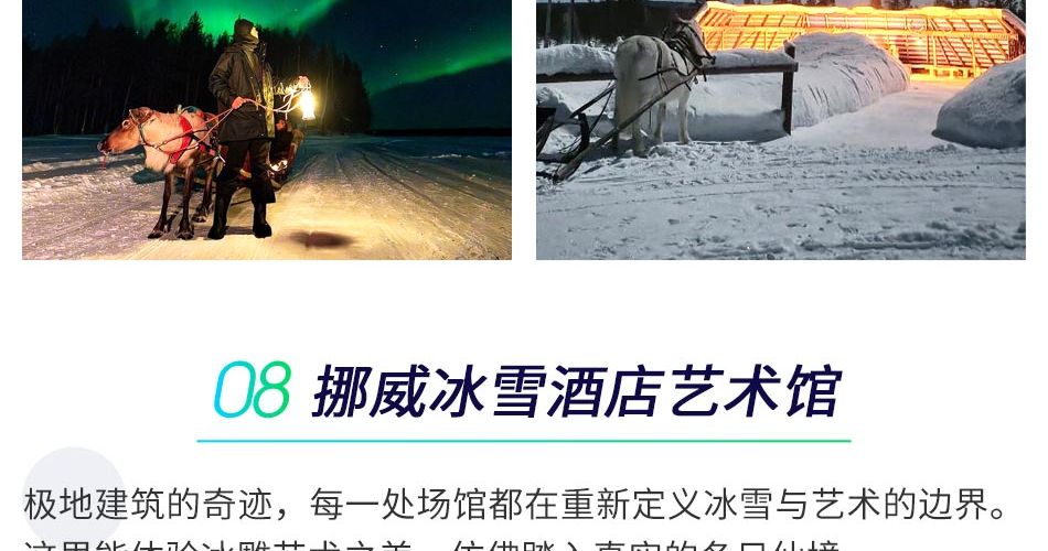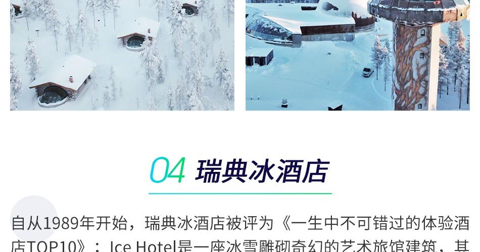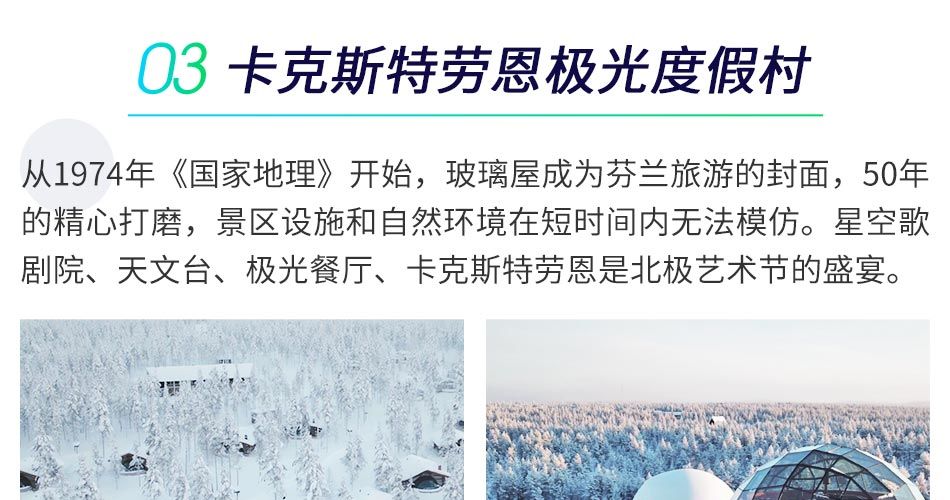 卡克斯特劳恩北极光度假村 Kakslautenan是由美国国家地理杂志刊登出的玻璃屋人类自然景观区,今天虽然有大量模仿者,可以模仿一个玻璃屋的样子,但是无法模仿整体kakslautenan的环境和世界高级度假村的光环,除了近百公顷的园区面积,景区内部的设施和自然环境无法模仿。整体景区如同一个大型的景观公园,有很多原生态的自然风景,除了入住的凯洛穹顶玻璃冰屋套房(Kelo)或招牌穹顶玻璃屋(Igloo),还有大量的配套设施,比如冰湖边烟熏桑拿,萨米艺术中心,“天文台”酒吧餐厅、“极光下”的餐厅,玻璃屋酒吧,极光歌剧院、圣诞老人宴会厅等等。景区内的各种活动项目也非常丰富,如狗拉雪橇丛林穿越,驯鹿园探访,甚至有雪地坦克,狩猎等罕见的极地体验项目。度假村的精致源于近50年来不断提升的细节品质,每一个角落的设计,每一种服务的品质,每一道菜品的设计,娱乐设施的路线和环节,设置房间内桌椅和床品的细节。在kakslautenan不仅仅是一个酒店,而是一个成熟的有着各种配套设施的风景区,游客来到这里,可以一整天什么都不做,只是在酒店的房间内欣赏窗外的风景和酒店的设施,享受纯洁的那片宁静。