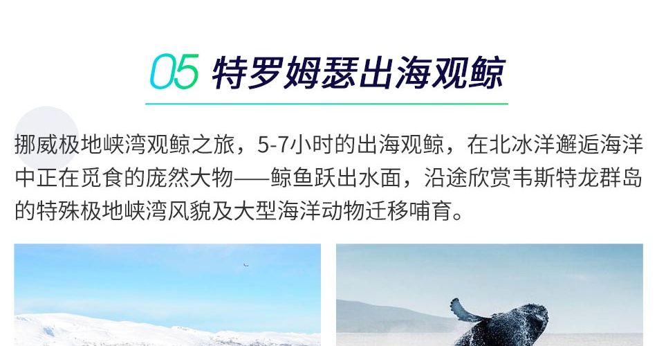 5-7小时左右的出海观鲸,觅食的鲸鱼一跃而出,调大光圈定格画面,与“海底霸主”同框,冬季的特罗姆瑟好像五彩“临冬城”,是新艺术运动和结构功能主义的遗珠,体验挪威北部大城市丰富的夜生活。 巡航期间,导游会为你介绍鲸鱼的相关信息,你也能近距离观看到这个伟大的海洋哺乳动物。虽然我们不能保证你一定会看到鲸鱼,但最近的观鲸巡航成功率一直保持在非常高的概率。因此,这将是一次绝妙的难得机会,去观看这些温柔的巨鲸靠近海岸去捕食冬季成群的鲱鱼。