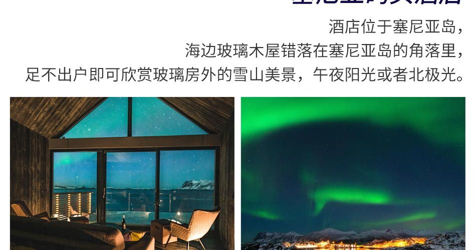 被称为极光天堂的塞尼亚码头酒店,一半风景被北冰洋所覆盖,另外一半位于峡湾与雪山的环绕之中,塞尼亚独特的挪威缩影地貌,在码头酒店内即可全览,酒店提供的极光套房构成了独特而创新的建筑风格,成为争先模仿的“塞尼亚风”。