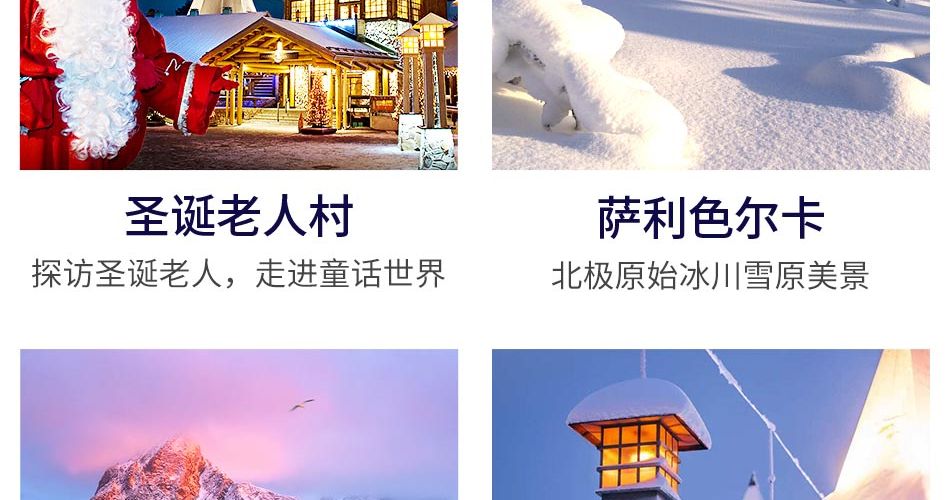 当天早上抵达罗瓦涅米,导游接站,随后前往游览圣诞老人村和主题公园,拜访由联合国认证的圣诞老人,在这里你不仅可以欣赏童话般的景致,近距离接触圣诞老人的驯鹿,还可以与圣诞老人合影留念,并且邮寄圣诞专属邮票和明信片。之后我们前往芬兰北部的萨利色尔卡。 夜宿萨利色尔卡假日俱乐部酒店或同等四星级其他酒店。