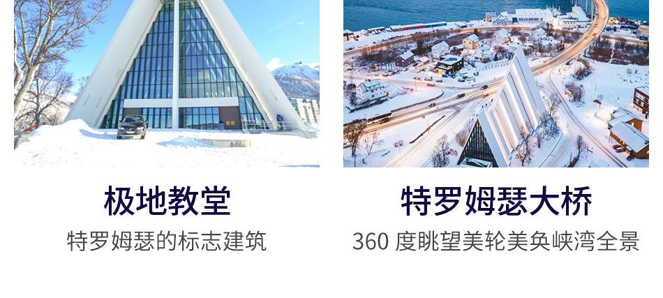 建于1958年的特罗姆瑟大桥是北极内壮观的建筑,横跨特罗姆瑟和山妖小镇,是特罗姆瑟的标志性建筑,跨海大桥的一侧是雪山峰式外形别致鲜明雪山小镇,许多关于特罗姆瑟的明信片都是在此拍摄。
