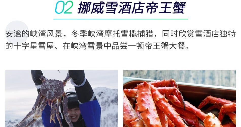 在安谧的峡湾风景、重视细节体验的雪酒店给帝王蟹捕捞项目带来了更多“美景”的感受、夏季出海捕捞,冬季摩托雪橇捕捞,同时欣赏雪酒店独特的峡湾景观、在峡湾雪景中品尝一顿帝王蟹大餐。