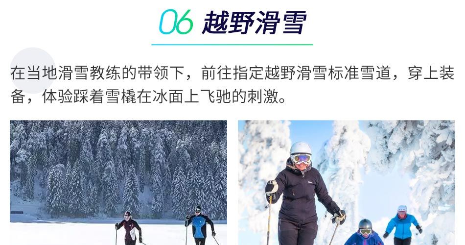 芬兰雪季拾趣——越野滑雪 穿越于民宿小屋间萨利瑟尔卡,这里拥有着得天独厚的地理优势,是畅玩滑雪运动的乐土。在萨利山的壮丽景色中,在芬兰特色民宿小屋之间穿梭。滑雪学校提供越野滑雪课程(CROSS-COUNTRY SKIING BEGINNER),专门为初学者设计的课程,通过学习基本的技巧,完成初学者线路,或是更新升级滑雪技巧,挑战进阶线路。课程包含全部雪具和器材,在当地滑雪教练的带领下,前往指定越野滑雪标准雪道,穿上装备,与教练一起穿越雪山。与高山滑雪不同,越野滑雪在北极圈内是基本的行走方式,在专业教练的教授下,很快就可以踩着雪橇在冰面上飞驰。(活动当天8岁以下儿童无法参加,全程需家长陪同)