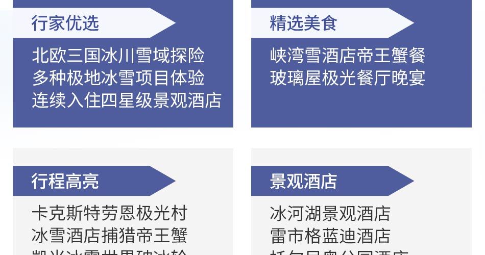 夏天乘坐皮划艇,冬天乘坐雪地摩托深入挪威峡湾领略极地风光,欣赏到奇崛的北欧极地地貌与壮阔的冰湖风光,游览一天的雪原探险后,前往帝王蟹捕捞的渔村和峡湾之间,欣赏旷世美景冬季夏季截然不同的独特体验。