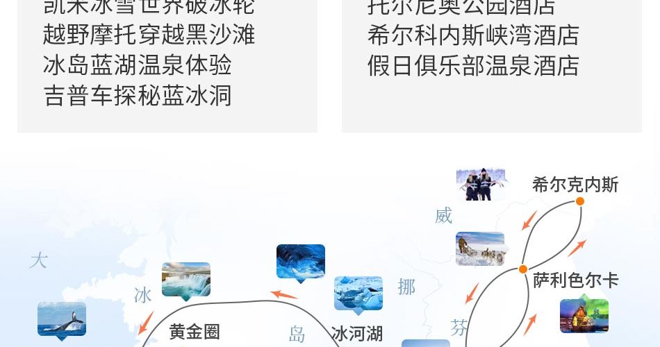 3、北欧极地区域,容易出现极端暴风雪,冰岛及地中海沿线容易出现大风天气。活动当天如遇气象部分发布橙色警告或狂风级或每秒分速超过28米或福式10级飓风,根据旅游法规和保险免责声明,我社将立即转移游客到就近的酒店休息,根据旅游法规则,我社不收取任何额外费用,也不承担任何未使用资源(包含但不仅限于酒店、门票、体验项目)的赔偿。
