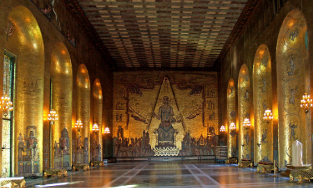 斯德哥尔摩市政厅建于1911年,位于瑞典首都市中心的梅拉伦湖畔,是斯德哥尔摩的形象和代表,市政厅中最著名的莫过于蓝厅,是每年12月10日举办瑞典盛宴--诺贝尔晚宴的地方。