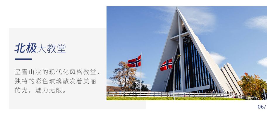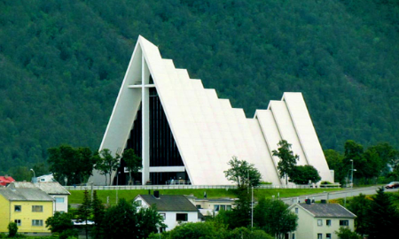 建于1965年,建筑设计呈雪山状,是将特罗姆瑟的冬季和极光有机结合而设计的具有现代感的教堂。其中教堂内的高约12米,重6吨的彩色玻璃以其厚重沉稳的独特设计,散发着美丽的光,所以被人们称为:不可不看的魅力彩色玻璃。