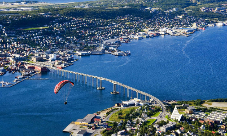 建于1958年的特罗姆瑟大桥是北极内壮观的建筑,横跨特罗姆瑟和山妖小镇,是特罗姆瑟的标志性建筑,跨海大桥的一侧是雪山峰式外形别致鲜明雪山小镇,许多关于特罗姆瑟的明信片都是在此拍摄。