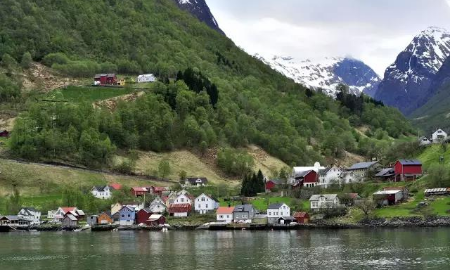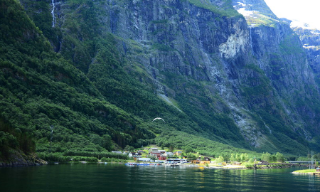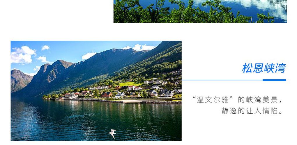 在松恩峡湾,碧波荡漾的湖水与森林相互缠绕着,四时风景亦会流露出不同的颜色和风情。乘着游船向峡湾深入驶去,视野也会随之开阔,见到大自然真正“浩瀚”的一面。偶然,你还会见到一些村庄和房屋零星分布在山间较平坦的地方。 纳柔依峡湾作为松恩峡湾最迷人的一个分支,于2005年被联合国列入世界遗产名录。从弗洛姆乘船,沿着奈略峡湾,行至古德旺恩(居德旺恩),沿途有高山绝壁、清澈流水、农场、瀑布······定会让你流连忘返,不虚此行。