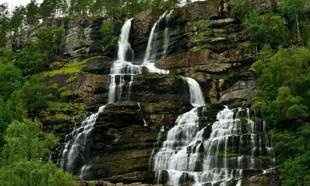 距离VOSS约12公里处,沿E16公路向Flam方向行驶了大约15分钟,路过这个大瀑布。瀑布曾经高达152米,如今大约只有110米。不像其他很多有名的瀑布,飞流直下,它的下落途中有多层岩石阻挡,形成台阶状,该瀑布已成为挪威第九大热门自然景点。