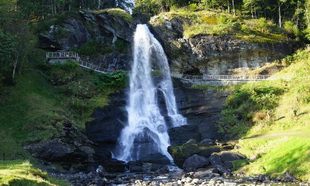 挪威出名的瀑布区,位于诺海姆桑德(Norheimsund)的大瀑布从近乎垂直的山坡浩浩荡荡奔腾而下,大自然爱好者可以在哈当厄尔峡湾获得无穷乐趣。这里峡湾和瀑布的雄浑壮美,有多个观光游览行程可供选择,您可在峡湾四周徒步远足,或是乘坐皮艇,从全新的角度探索峡湾。当地其他深受人们青睐的活动还有垂钓、漂流和骑行。 山路是不容错过的景点。山路沿着陡峭的山坡蜿蜒而上,瀑布飞流其间,每年5、6月份的时候尤为壮观。哈当厄尔峡湾必去景点,这座瀑布的独特之处是旅行者可以从后面穿过瀑布,身上却一点都不被打湿。