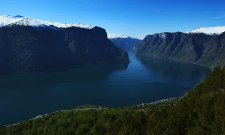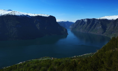 松恩峡湾(Sognefjord) 是挪威最大的峡湾,也是世界上最长、最深的峡湾,全长达240公里,最深处达1308米。两岸山高谷深,谷底山坡陡峭,垂直上长,直到海拔1500米的峰顶。该峡湾最狭窄且最具盛名的一个分支是奈勒伊峡湾(Nærøyfjorden),其最窄处的水面只有250米宽,这个分支被列入了世界遗产名录。