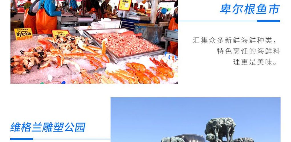 位于卑尔根港区的世界闻名的传统鱼市Fisketorget,从十三世纪起,就汇集了各种新鲜的海鲜,等待着人们来享用。布吕根老城区的传统鱼市场,最初是一个完全开放式的街边摊档形式的市场,如今发展到大型的室内的渔市区域,渔市供应的各种海鲜品种多样,新鲜美味,从鲜活到刺身,各种烧烤,鱼干,海鲜饭和寿司,展现并品尝到多样化的海鲜料理,相信每个人都可以在这里品尝到自己喜欢口味的海鲜。