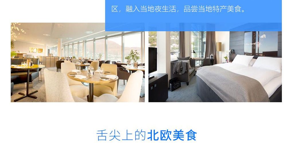 精选位于城市中心位置的北欧连锁四星级酒店,舒适的入住体验,丰盛的斯堪的纳维亚早餐。更重要的是酒店出门就是热闹街区,毗邻卑尔根老城、鱼市等景点。夏季北欧日照时间长,晚上您可自由参观具有小镇风情的卑尔根,融入峡湾地区的城市居民中,走出门,造访卑尔根的木屋商店和酒吧,体验这座城市闻名遐迩的生活方式。或者您可在卑尔根鱼市品尝鲜美的海味。酒店附近的Lysverket餐厅为您提供卑尔根很好的食物,饮料和音乐,这里有来自西海岸的海鲜,自制果汁和本地啤酒,当地主厨Christopher Haatuft等一批新生代的专业厨师,将新捕获的海鲜与来自内陆的食材两相融合,制作出美味佳肴。