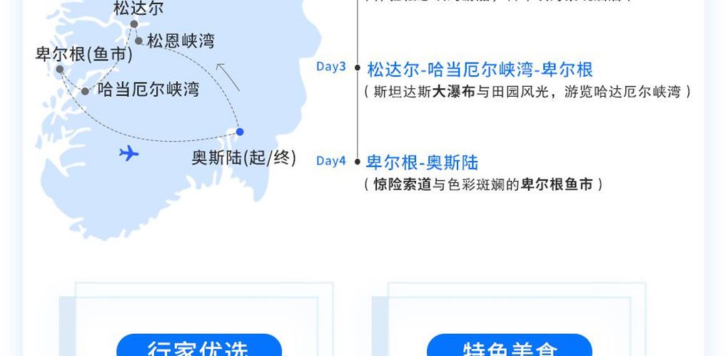 重要提醒:(根据航班和团期排列情况,部分团期的行程游览顺序或将前后调整,行程往返次序相反,但游览内容一致,行程改变不影响全程体验,航班上无导游陪同需要游客自行乘机前往目的地,具体行程安排以出团通知书为准)。如选订6月21日、7月19日、8月16日团期,行程为去程奥斯陆乘车前往松达尔,回程卑尔根飞奥斯陆,,游览内容不变,行程调整成A线,具体以实际出团通知为准。