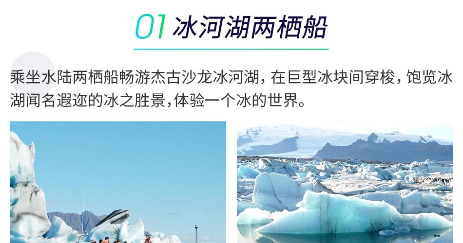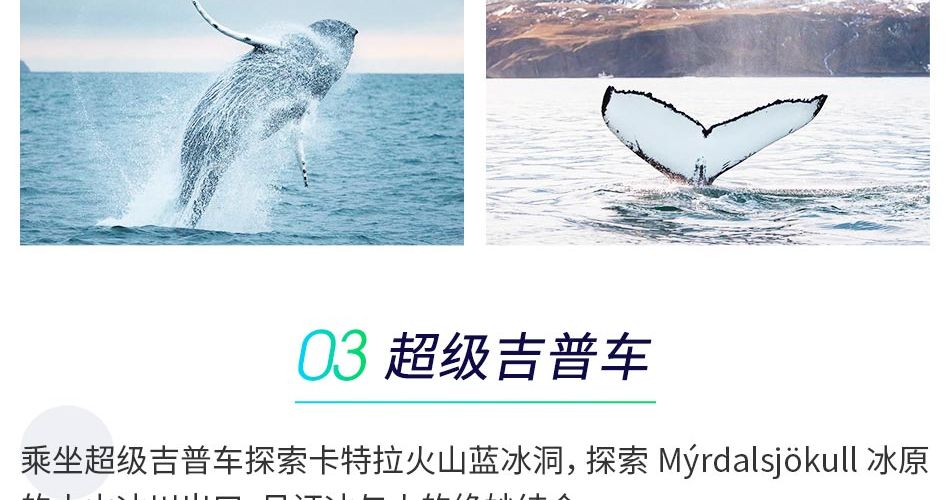 6、活动:超级吉普车+卡特拉火山+火山蓝冰洞、冰河湖水陆两栖船、出海观鲸。