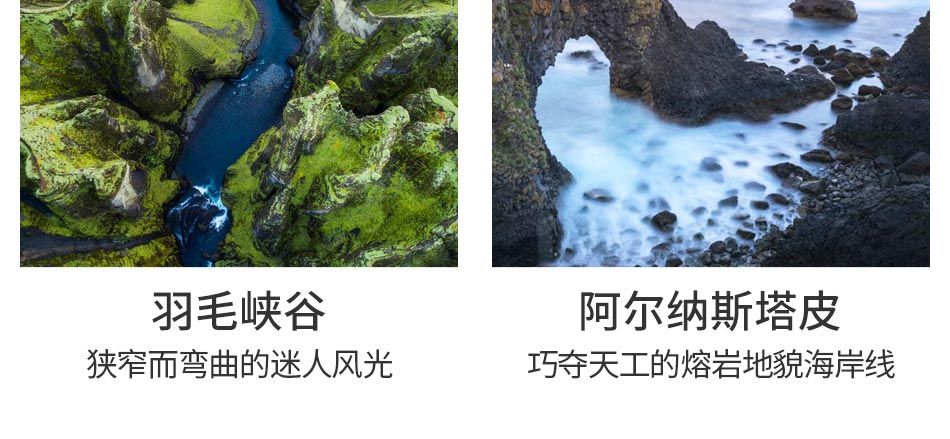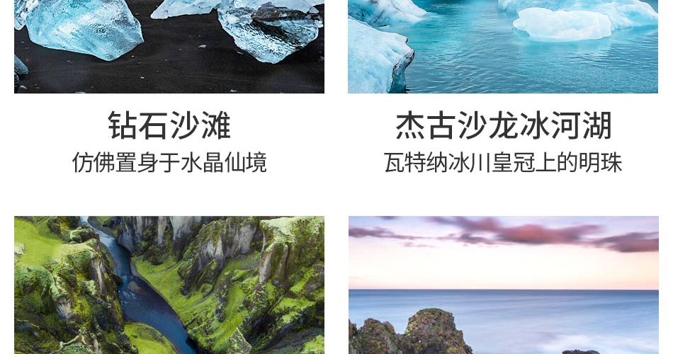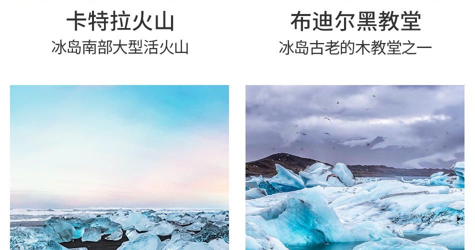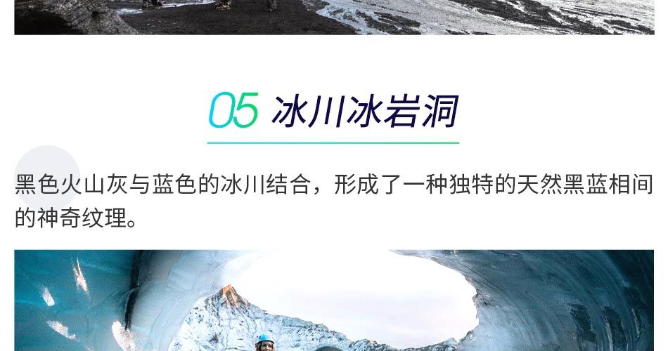 【水晶蓝冰洞和火山蓝冰洞皆为中文翻译商品名称,地理名称为:Ice cave。由于夏季冰洞的结构不稳定,需要前往具有火山岩石支撑的冰洞,冬季和夏季的阳光折线不同,因此产生的反射光线不同,由此而来的蓝冰洞和黑冰洞的色彩差异。】
