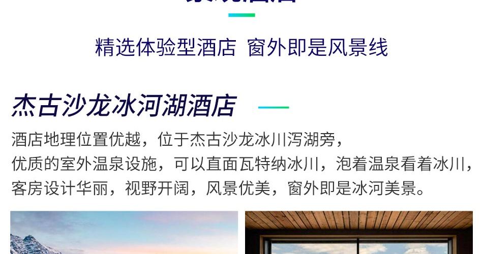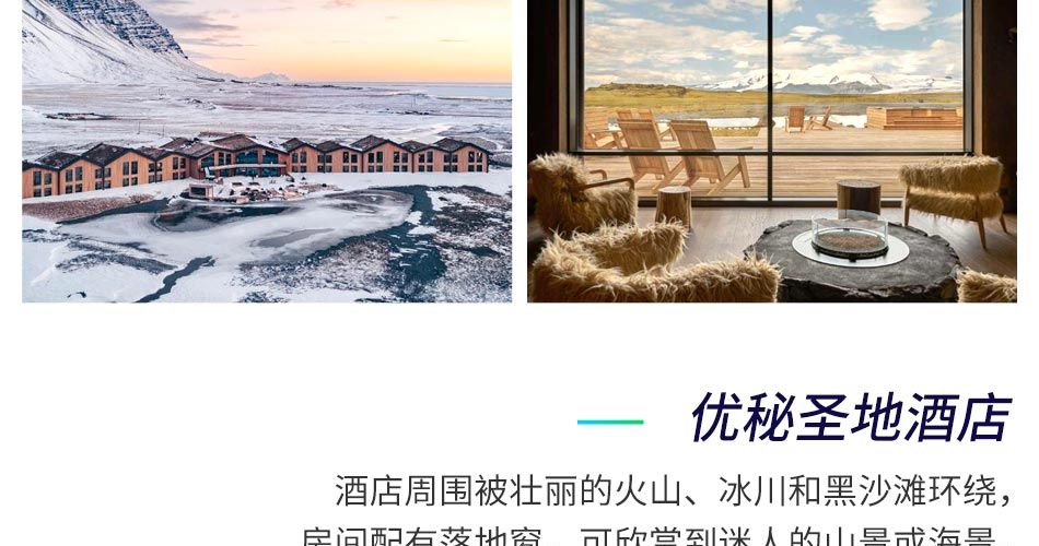 2、酒店:舒适型四星级酒店4晚(由于冰岛当地取消星级评定,酒店星级以Booking.com酒店星级为标准,其中地平线酒店和杰古沙龙酒店不参与Booking.com星级评选);