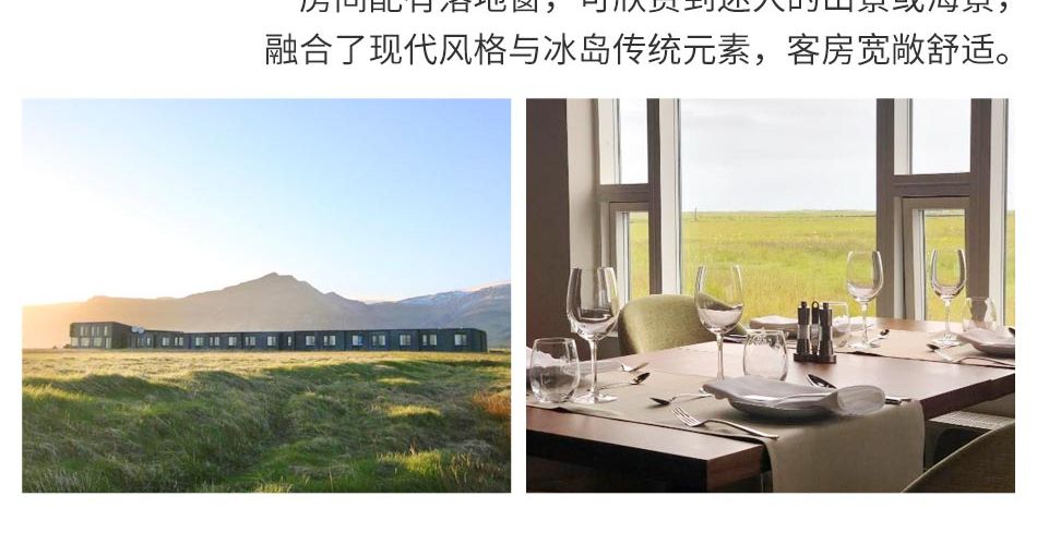 位于杰古沙龙冰川泻湖的冰岛著名景观酒店,以其优质的室外温泉设施和独居特色的前台大厅,赢得了超高的好评,被认为冰岛新晋景观酒店的代表之作。慕名而来的游客被华丽的客房设计与窗外的冰河美景相结合,优质餐饮服务和极佳的地理位置而流连忘返,成为心目中值得推荐的冰岛酒店。