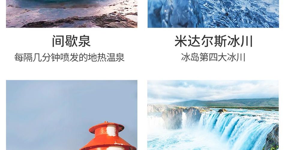 冰岛黄金圈四季都有不同的风采,如此冷酷又飘渺的冰岛,骨子里自带着一种桀骜,感受它的冷峻、温柔与热情,爱上冰岛的每一面、每一秒、每一帧。 黄金圈是冰岛南部非常知名的旅游路线,为冰岛游的精华所在,由三大旅游景点组成:黄金瀑布、盖歇尔间歇泉地热区和辛格维利尔国家公园。黄金瀑布气势宏大,景色壮观,湍急的水流顺势而下,落差达50多米,发出震耳欲聋的轰鸣。阳光下,在蒸腾的水雾中,布满闪着金光的点点水滴,亮艳的彩虹若隐若现,仿佛整个瀑布是用黄金造就。盖歇尔间歇喷泉到处冒出灼热的泉水,热气弥漫,如烟如雾,为世界最著名的间歇泉之一。