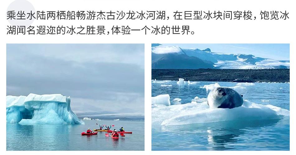 湖里漂浮着形态各异的千年浮冰。这是一个可以在路边就能观赏的冰湖,除了白色,这里的浮冰还呈现出蓝色、绿色、以及由于火山灰的掺杂而形成的灰色、棕色。您有充分的时间在此近距离观赏拍摄,运气好的话还可以看到成群结队晒太阳的海狮。 远处的冰川犹如被天空施加了魔法,之前还像是从冰川上流下的水,顷刻间却全冻结成了冰,时间仿佛停在那刻静止了一样。