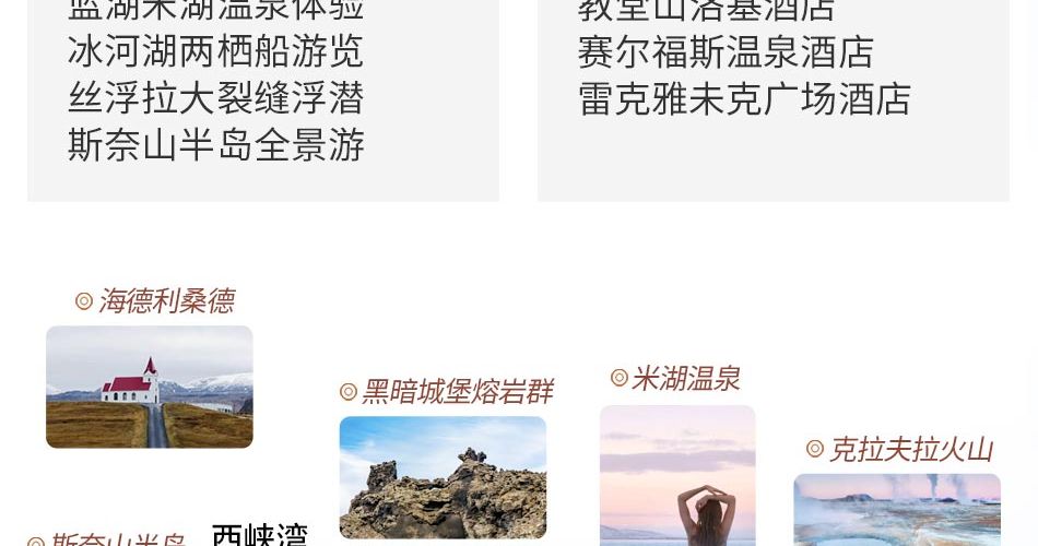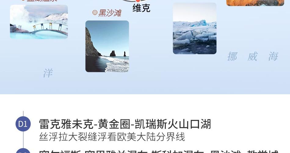 重要提醒:根据团期排列情况,部分团期的行程游览顺序或将前后调整,行程往返次序相反,但游览内容一致,行程改变不影响全程体验,周六发出的团期行程第一天进行雷克雅未克游览及观鲸活动,周日发出的团期行程最后一天进行雷克雅未克游览及观鲸活动,其他行程一致,具体行程安排以出团通知书为准.
