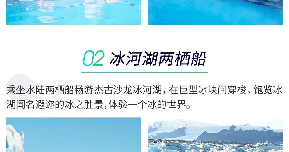 早餐后,从酒店出发前往羽毛峡谷参观,随后前往冰河湖景区,游览冰河湖与钻石沙滩,体验冰河湖两栖船,近距离接触冰河冰川,随后前往龙虾镇——霍芬,夜宿霍芬随后自由前往当地特色龙虾餐厅。