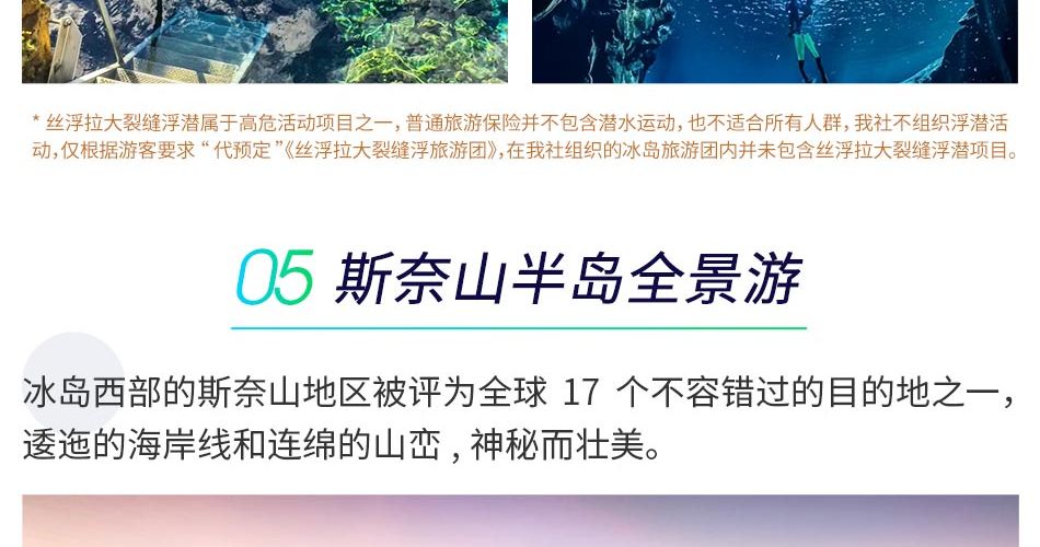 《丝浮拉大裂缝浮潜团》不适用人群:65岁以上老人,13岁以下儿童,孕妇、心脏起搏器安装者,高血压等。