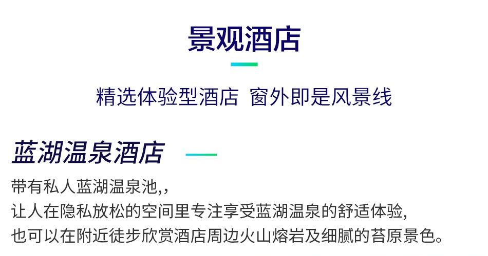 酒店住宿客人私享蓝湖温泉区域,私密性佳,让客人能在隐私放松的空间里,专注享受蓝湖温泉的舒适体验。酒店房间内可以欣赏火山熔岩或细腻的苔原景色。酒店配有四个风格迥异的餐厅,不仅有高超的厨艺,当地的食材还有体验独特的风景,位于享有温泉风景的蓝湖早餐,也是视觉与味觉的双重震撼。