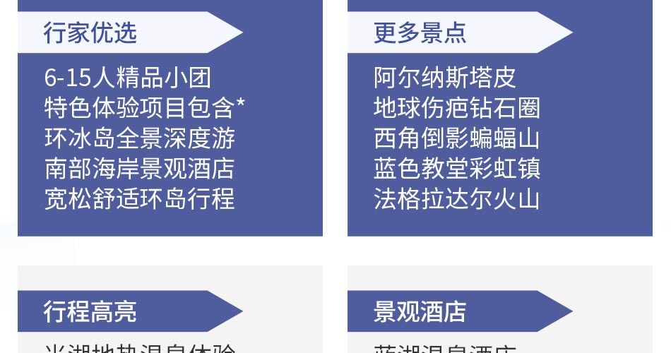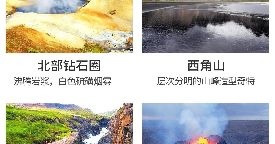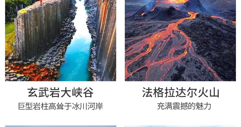 备注:由于活火山的不可预测性,我社无法对法格拉达尔火山的游览做任何判断,特别是Meradalir岩浆裂缝的不稳定性导致法格拉达尔火山群过于稳定或过于频发,如427公路未宣布封闭, 将能看到火山喷发期间形成的广阔熔岩区遗迹(新熔岩流入旧熔岩和地热活动遗迹),请注意本产品并非专业地质探险团,因此该景点并未配备专业徒步向导。
