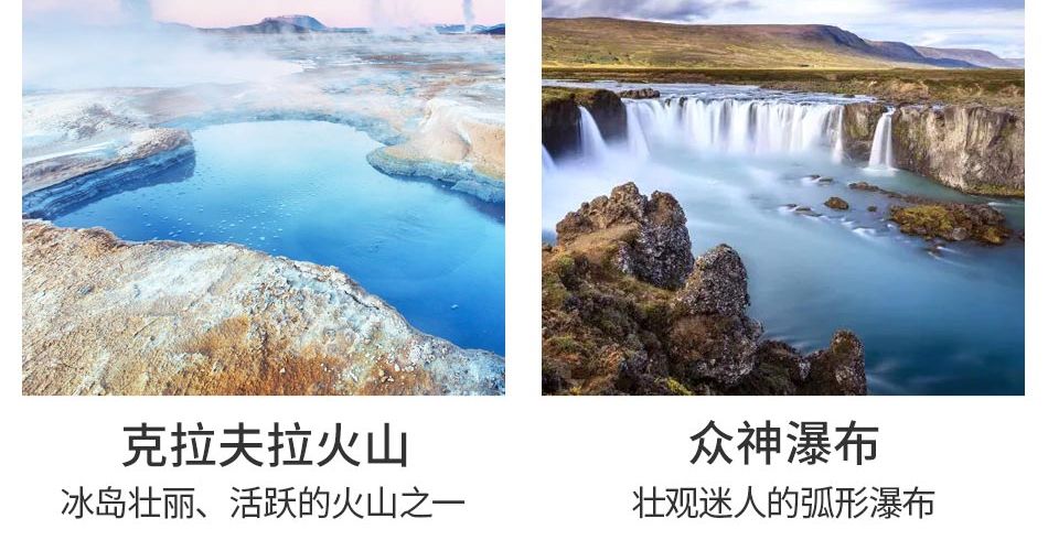 早餐后,前往克拉夫拉火山参观,之后前往米湖温泉体验米湖温泉,随后游览黑暗城堡熔岩群,随后前往众神瀑布。夜宿阿克雷里。