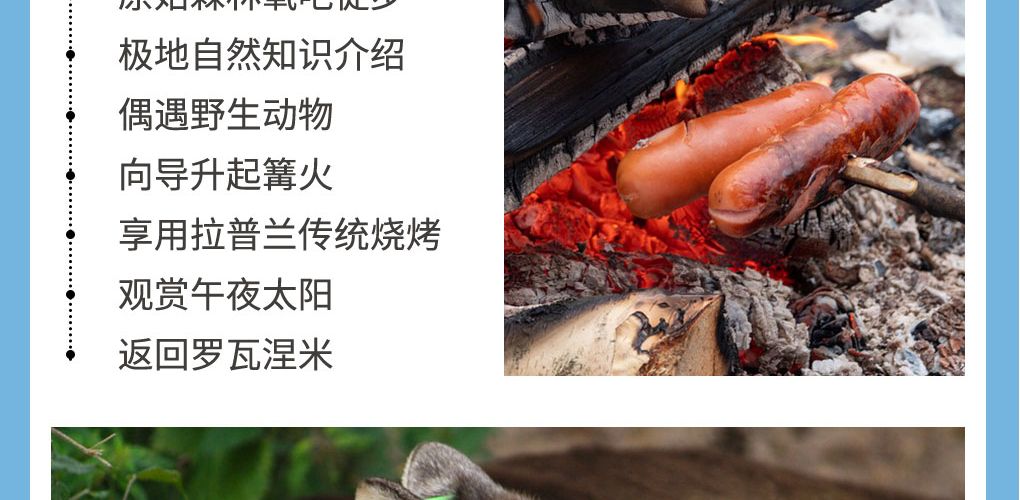 返回罗瓦涅米之前,向导会给您展示如何用最传统的拉普兰方式升起篝火,并为您准备美味的特色烧烤,让我们一起沉醉在这静谧的美景与慢时光之中!