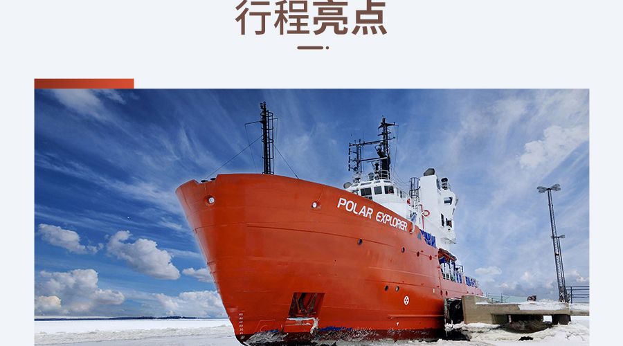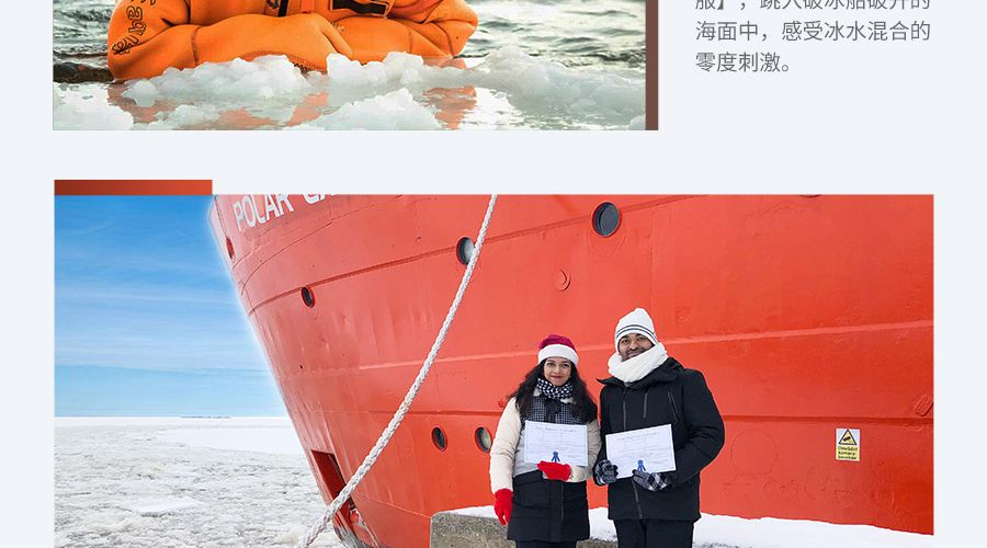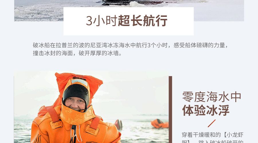 出发前往波的尼亚湾的终年冰冻海港,参加勇者挑战——破冰轮及冰浮体验活动。破冰轮破开厚厚的冰面,我们将穿上特质的服装,跳入冰冷的海水中,不过不用担心,特制服装会保证你在海水中也能保持正常的体感温度。
