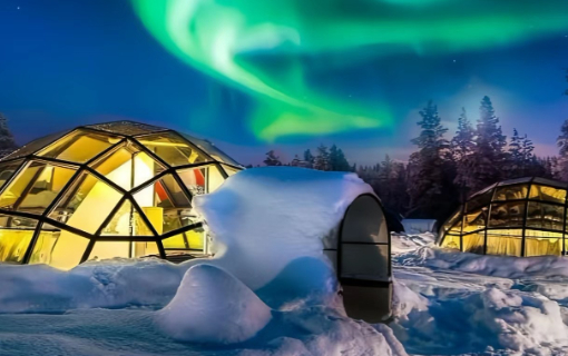 穹顶玻璃屋度假村玻璃冰屋西村(west village)的凯洛穹顶玻璃冰屋套房被授予人文景观度假村及美国国家地理杂志评选自然人文景观区,入住卡克斯劳塔纳穹顶酒店的凯洛玻璃冰屋套房,在星光下的极光漫步,于北极自然奇景下赞叹野旷天低雪树与极光的相映成辉。 凯洛穹顶玻璃冰屋套房,独立的玻璃屋及独立内部走廊通向原生态的豪华木屋,面积约80平米,房间内可以点篝火,分为浪漫穹顶玻璃冰屋,儿童住宿区,豪华大床,独立桑拿区,从纯木头装修,质感和舒适度非常高。