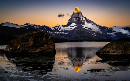 马特宏峰(Matterhorn)位于瑞士瓦莱州小镇采尔马特,海拔 4478 米,是阿尔卑斯山美丽的山峰,也是瑞士引以为骄傲的象征,以其一柱擎天之姿,直指天际,其特殊的三角锥造型,更成为阿尔卑斯山的代表,每当朝晖夕映,长年积雪的山体折射出金属般的光芒。