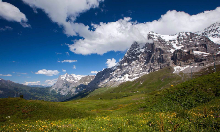 少女峰位于因特拉肯以南二三十公里处,海拔 4158 米,是阿尔卑斯山脉的较高的山峰之一。山顶常年被冰雪覆盖,而山下却绿草茵茵、风景秀丽,是瑞士有名的观光及户外运动胜地。少女峰地区已于 2001 年被列为世界自然遗产。