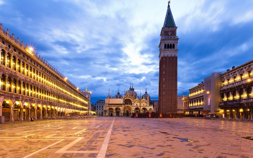 是威尼斯的中心广场,曾被拿破仑称作“欧洲美丽的客厅”。广场三面被宏伟壮丽的宫殿围绕,东面耸立着高大的钟楼和圣马可教堂。自古以来,就是威尼斯政治、宗教及传统节日的公共活动中心。