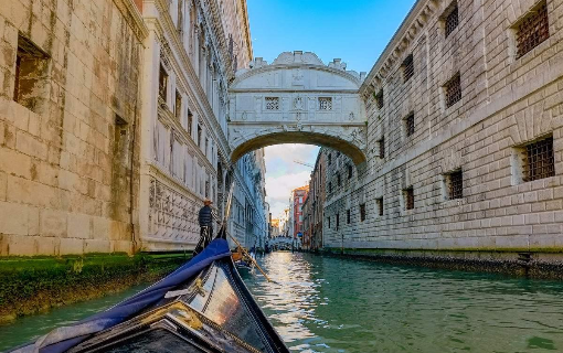 叹息桥是古代由法院向监狱押送死囚的必经之路。叹息桥造型属早期巴洛克式风格,桥呈房屋状,上部穹隆覆盖,封闭得很严实,只有向运河一侧有两个小窗,当犯人在总督府接受审判之后,重罪犯被带到地牢中,在经过这座密不透气的的桥时,只能透过小窗看看蓝天,从此失去了自由,不自主的发出叹息之声。听说恋人们在桥下接吻就可以天长地久,而电影「情定日落桥」就在这取景的。