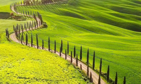 蜿蜒曲折丝柏树小径、两旁种满意大利柏树的乡村道路,独特造型的弯道和整齐排列的丝柏树,成为托斯卡纳田园风光的象征之一。道路两侧的柏树在阳光的照射下投下斑驳的影子,营造出一种宁静而诗意的氛围,吸引了无数摄影爱好者和游客前来打卡。