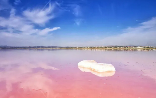 被称为“托雷维耶哈盐田”,这里湖水夏季呈现粉色,冬季则是橙红色,不同时节有着不同的色彩,1989年被西班牙政府列为自然公园。众多旅行家都慕名前往,想一睹那一望无际的迷人的少女粉。托雷维耶哈粉红盐湖不大,水也不深,距离地中海很近,据说也是当年陆地抬升形成的泻湖。这片湖泊含有大量盐分,所以附近也有居民采盐。蓝色的天空、粉色的湖泊、阳光、沙滩,非常适合度过慵懒的假日。