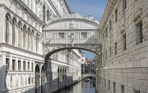 叹息桥是古代由法院向监狱押送死囚的必经之路。叹息桥造型属早期巴洛克式风格,桥呈房屋状,上部穹隆覆盖,封闭得很严实,只有向运河一侧有两个小窗,当犯人在总督府接受审判之后,重罪犯被带到地牢中,在经过这座密不透气的的桥时,只能透过小窗看看蓝天,从此失去了自由,不自主的发出叹息之声。听说恋人们在桥下接吻就可以天长地久,而电影「情定日落桥」就在这取景的。