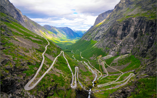 位于挪威西南部,在挪威语中意为“旋转的梯子”。它连接劳马的翁达尔斯内斯和努达尔的瓦尔达尔。这条公路有11个发夹弯,高出海平面2800英尺(约合853米),平均坡度达到9%。挪威的 63号公路特罗斯蒂高原最高处段因沿途到处是石头故称“精灵之路”。