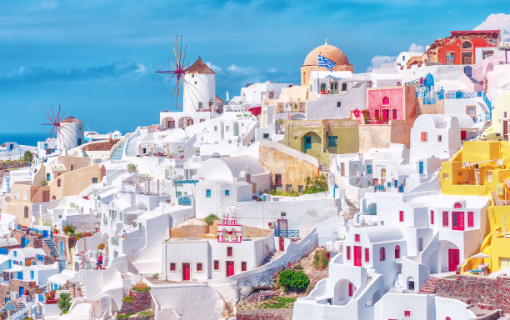 早餐后,我们将从雅典Piraeus码头乘坐渡轮前往【圣托里尼岛】(行船时间一般为07:25-14:50,以渡轮公司公布的具体时间为准)。下午抵达圣岛后,我们将前往【伊亚】,欣赏日落。蓝色的天空与海洋构成了庞大的背景,成群的白色房屋镶嵌在拔地而起的峭壁,静静地守候着爱琴海的每一个日出与日落。