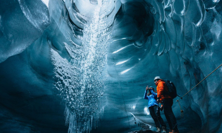 【水晶蓝冰洞和火山蓝冰洞皆为中文翻译商品名称,地理名称为:Ice cave。由于夏季冰洞的结构不稳定,需要前往具有火山岩石支撑的冰洞,冬季和夏季的阳光折线不同,因此产生的反射光线不同,由此而来的蓝冰洞和黑冰洞的色彩差异。】